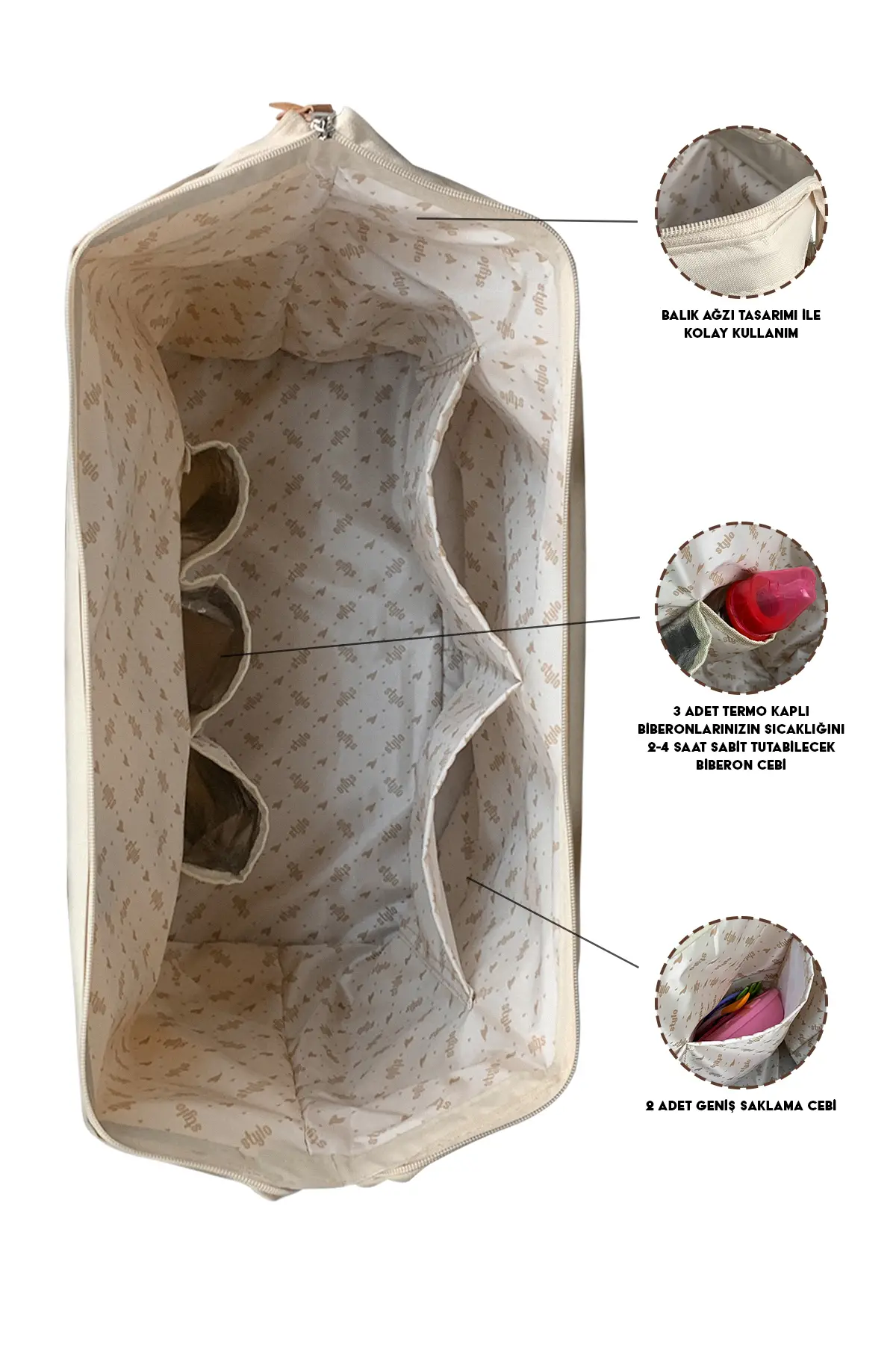 Bebek bakım çantanıza ihtiyaçlarınızı rahat yerleştirmeniz için üst kısmında çelik tel çerçeve ile desteklenmiş balıkağzı şeklinde ve çift femuar ile açılan iç bölümü 3 adet biberon sığabilen termal malzemeleri ile desteklenmiş 4 saat e kadar içerisine konulan sıvıyı muhafaza edebilen pratik termos özelliği bulunmaktadır.